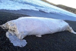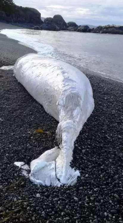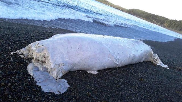The whale is in an advanced state of decomposition and is missing its head, fins and outer skin. It appears to be white, waxy blob.