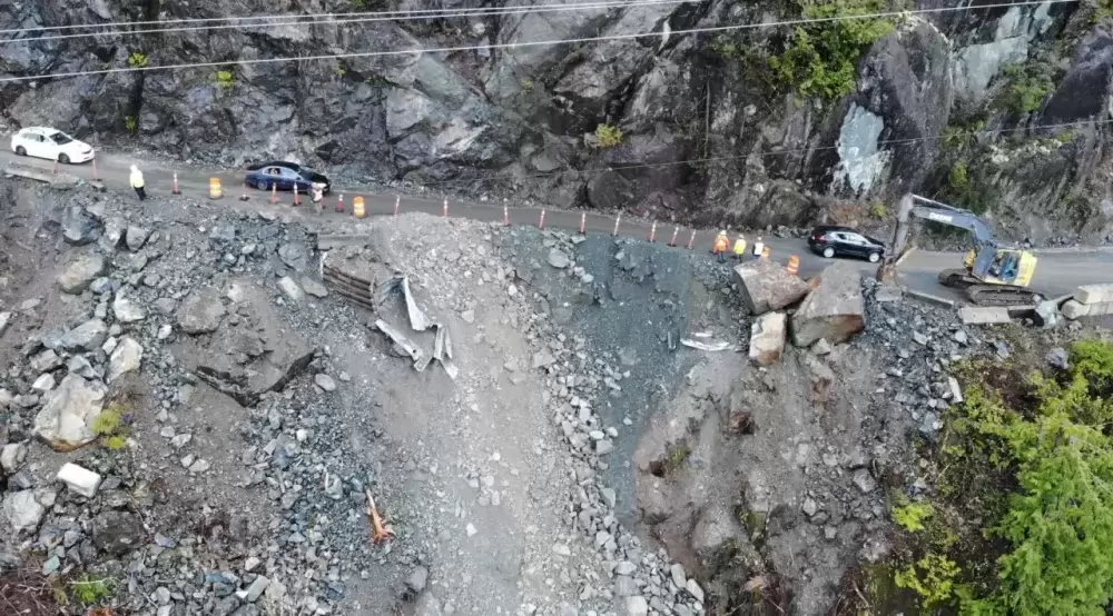 The Ministry of Transportation and Infrastructure says that more rock above the damaged road will be blasted away in order to complete the work.