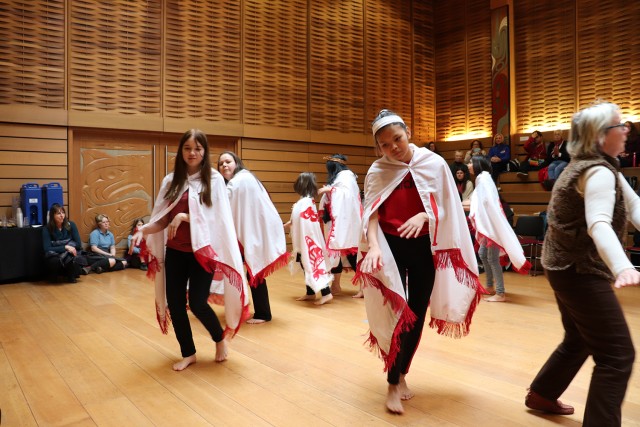 Guests to the event, which was held March 3 in the First Peoples House, were treated to performances by Pacheedaht First Nations members with support from their Ditidaht relatives. The joy was evident in the faces of the young people as they danced across the floor in their new regalia. They were excited, happy and proud.