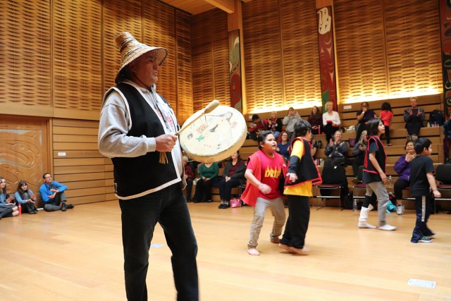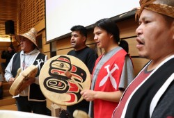 A Ditidaht singer performs a Ci’qaa (prayer chant) in a gathering place on the grounds of the University of Victoria. His powerful prayer is followed by a paddle dance led by young members of the Pacheedaht Nation, who had just learned the dances within the past 12 months.