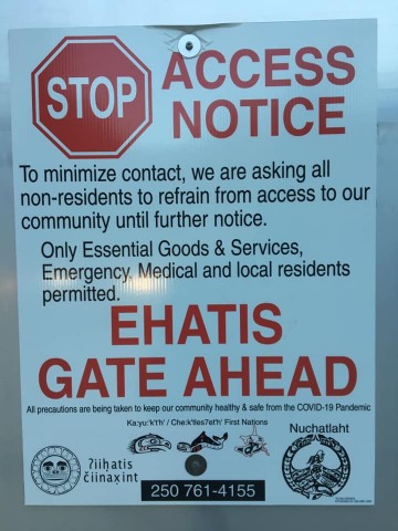 This week the Ehattesaht First Nation announced that a gate had been closed in their reserve next to Zeballos to anyone but local residents and essential services. This blocks road access to the Nuu-chah-nulth communities of Ehatis, Oclujce and Kyuquot. This measure follows a local state of emergency declared for the Ka:'yu:'k't'h'/Che:k'tles7et'h' First Nations village of Houpsitas on Vancouver Island’s northwest coast, restricting access to residents only, while limiting trips outside to essential ventures.