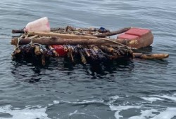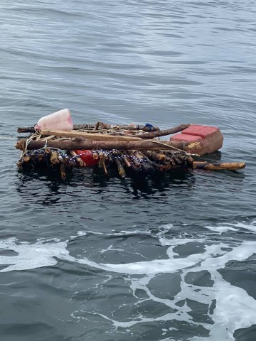 The collection of sticks is tied together with quarter-inch crab pot line, according to John. It was floating on two plastic five-gallon jerry cans along with about five smaller jerry cans, the nozzles taped shut.