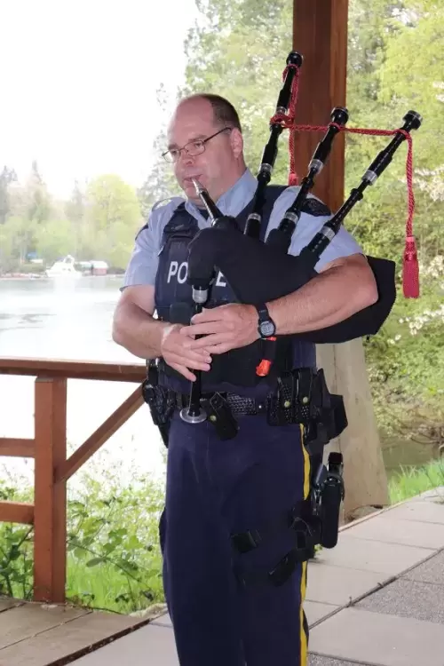 In the quieter times of COVID-19 isolation comes an unusual sound, the mournful wailing of bagpipe music drifting over the Somass River. The piper is RCMP Constable Pete Batt and he played his pipes on the stairs of Tseshaht’s Maht Mahs gym on the morning of April 23.