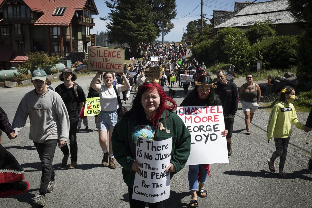 Demonstrators from Ucluelet, Tofino and the surrounding Nuu-chah-nulth communities gathered to march for Chantel Moore, a Tla-o-qui-aht woman who was fatally shot by the police in New Brunswick on June 4, and for George Floyd, a 46-year old black man who was killed by a white police officer on May 25 in Mineapolis.
