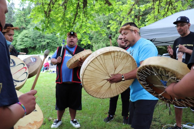 White, fluffy eagle down drifted on the breeze as Robert Watts performed a prayer chant. He welcomed the people on behalf of Tseshaht Ha’wiih before joining singers as they performed two of the Ha’wiih’s songs.