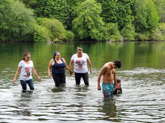 Those closest to Chantel, including her mother and daughter, entered the water to be refreshed as the flowers drifted past. A family member stood in the water with them, shaking a rattle to his prayer chant as the group plunged into the water, sobbing with grief.