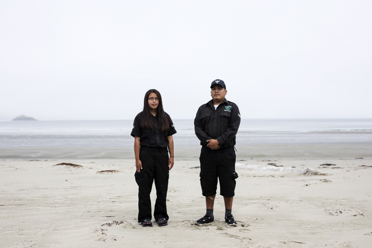 Dressed in black uniforms, Carol Curley and Lance Tom patrolled the empty stretch of Long Beach in front of Esowista.
