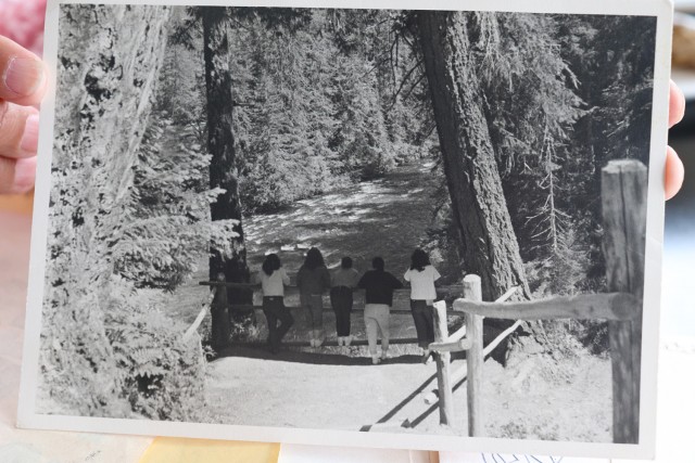 The folder contains a black and white photograph of a group of AIRS girls taken in 1959 at Cathedral Grove. Although beautiful, the photograph only shows the backs of the girls who are leaning over a railing looking into a creek. The back of the photo reads, “Some of our girls on a bridge. Cathedral Grove. Alberni Indian Residential School. Summer /59.”