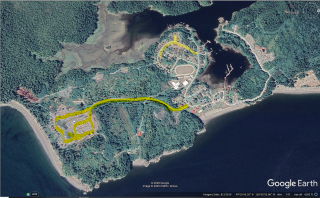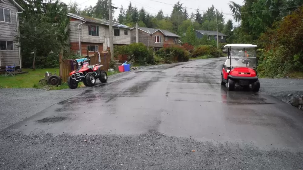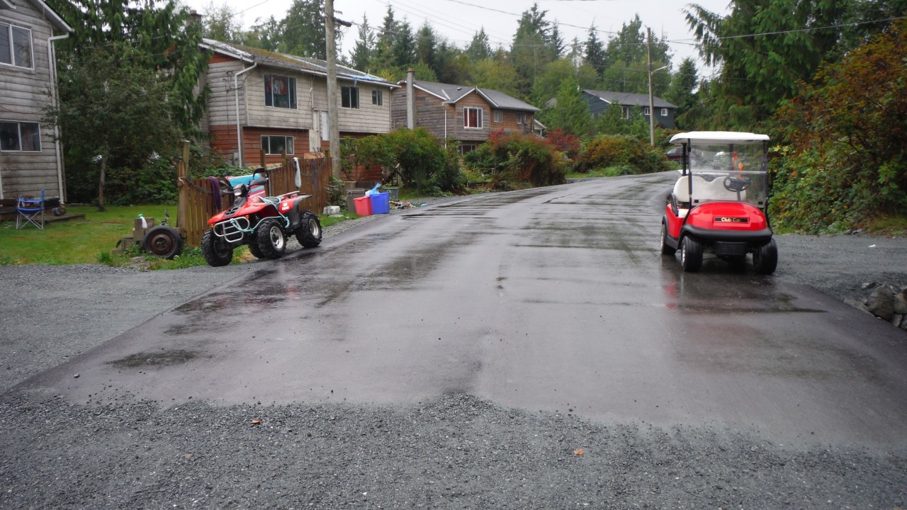 The first road to be paved in Ahousaht leads up to a residential neighborhood called Lot 363. Louie said that project used 2,000 tons of asphalt. The Happy Hill road requires 800 tons of asphalt. If the paving were to be done in 17 phases, that would mean additional costs associated with ferrying equipment and materials back and forth an additional 14 times.