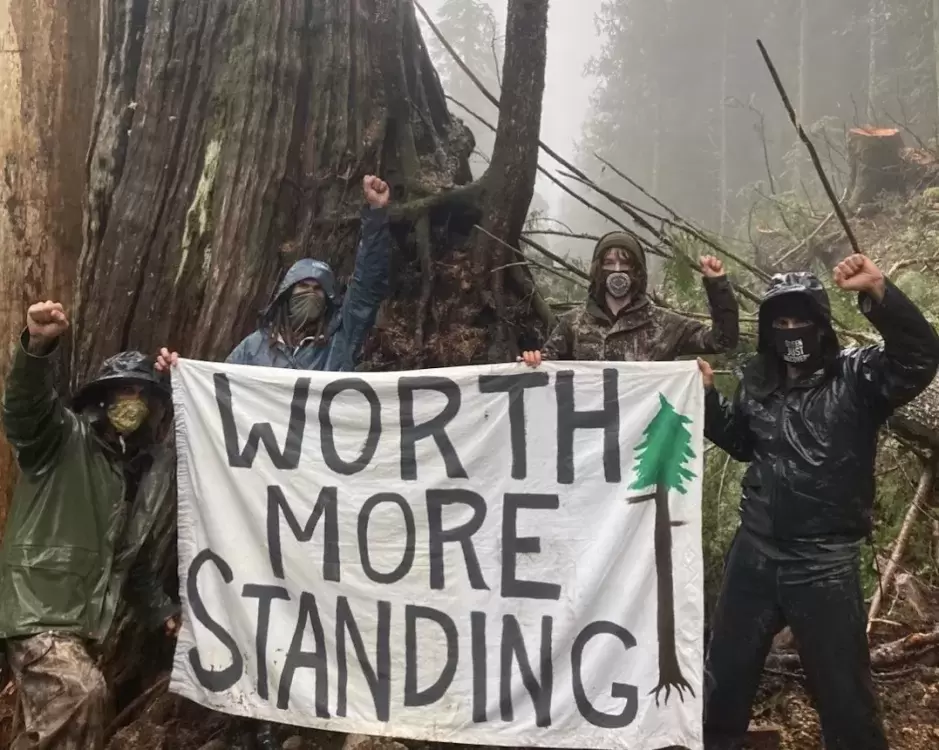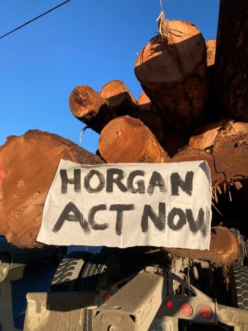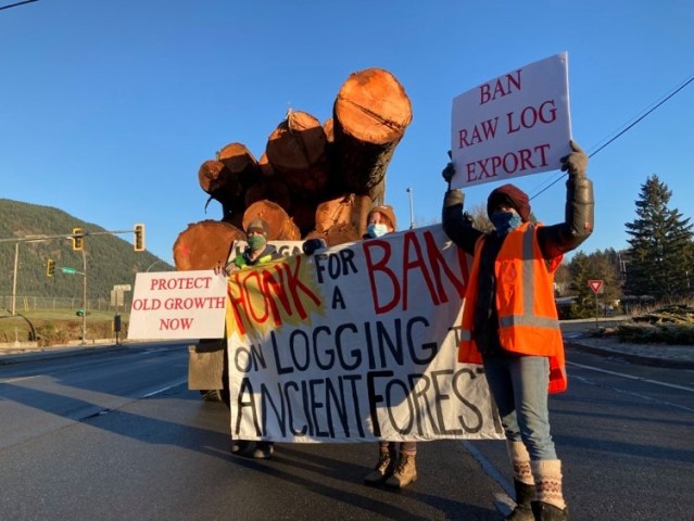 Then on Dec. 2 a collective calling themselves the Rain4est Flying Squad blocked logging trucks north of Duncan in protest of harvesting just outside Carmanah-Walbran Provincial Park, which lies south of the Caycuse River. A vehicle carrying old-growth logs was held up for an hour by the demonstrators forcing a red light at a crosswalk. Other northbound logging trucks passed the blockage, but protestors stopped them for several hours before the vehicles reached a log sort in Ladysmith, according to the Rain4est Flying Squad.