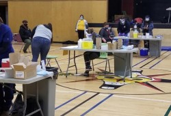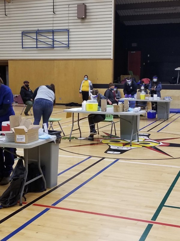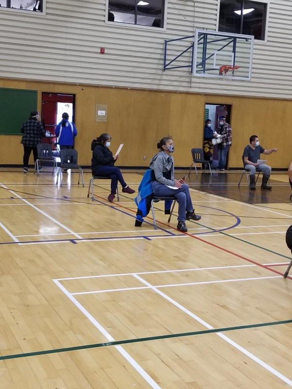 Since late December, Ahousaht chief and council, NTC nursing and FNHA staff have been working together to plan the safe and orderly delivery of the vaccine. With social distancing protocols still in place, Ahousaht members came up with a plan to bring residents to the Maaqtusiis gym a few at a time, similar to the procedure for their food distribution process.