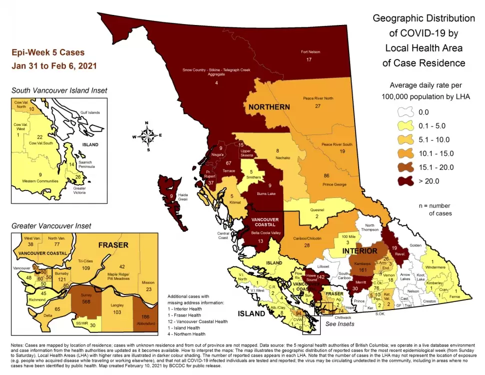 The Cases by Local Health Area Map will be updated again on Sunday, Feb. 21.
