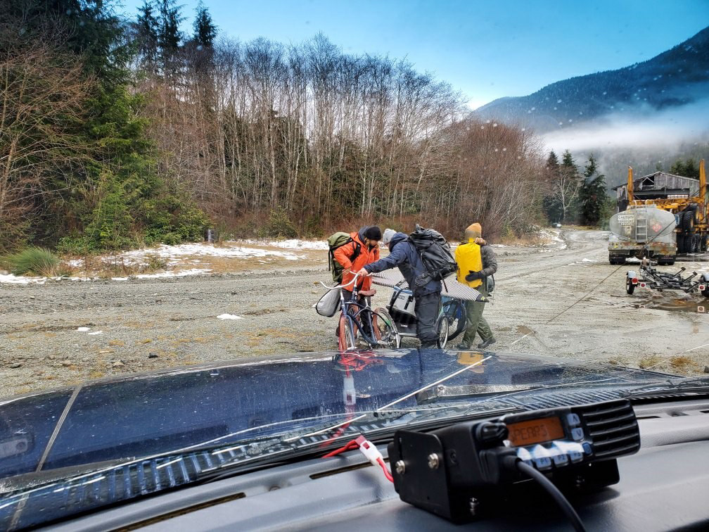They left Stewardson Inlet and biked about eight kilometres over a rough logging road to Hesquiaht Point. Charleson said that the road is not maintained and is impassable by vehicles due to washouts and landslides.