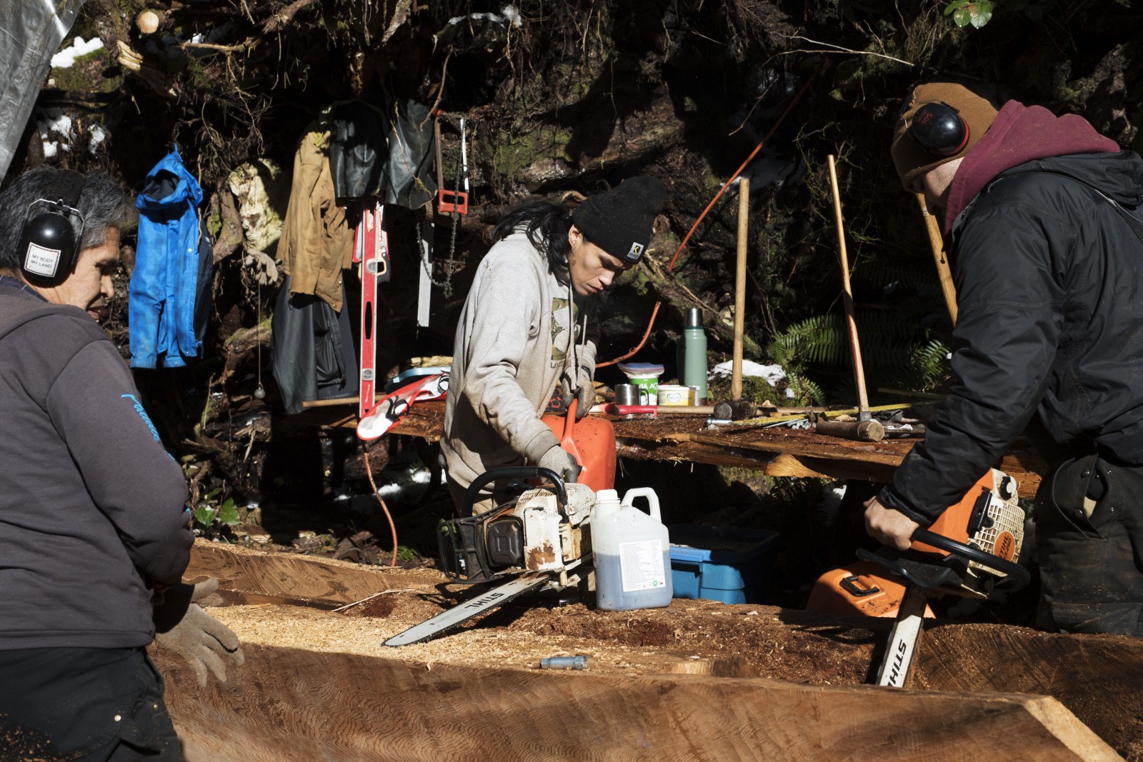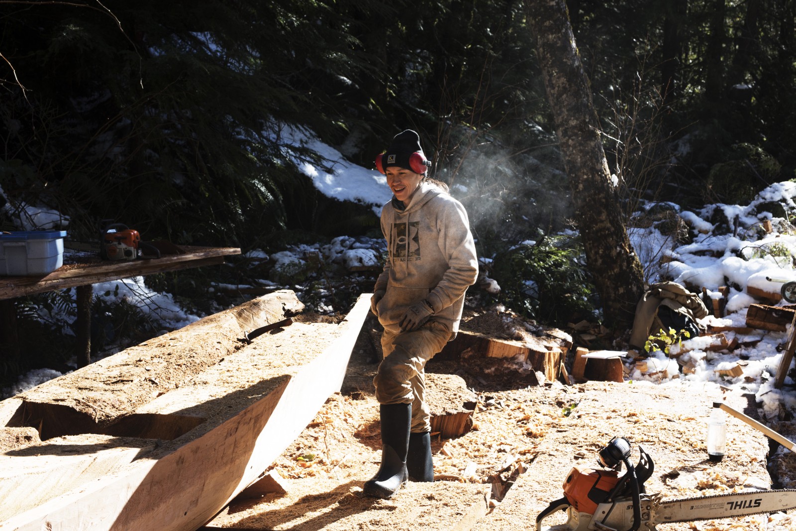 Nestled in the forest off the Pacific Rim Highway, the team of carvers shaped the canoe, or chaputs, from a fallen red cedar tree.
