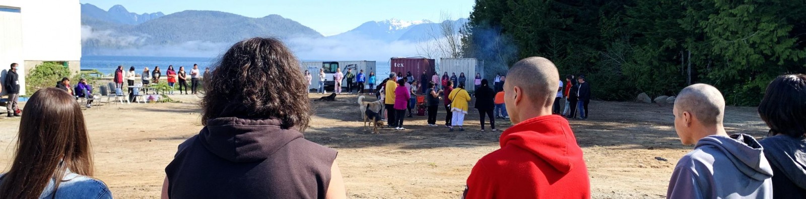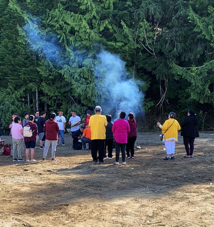 With former day school students and young people from Maaqtusiis School looking on, Dave, Wally and others cleared the site of negative energy with eagle down, cedar branches and prayer.