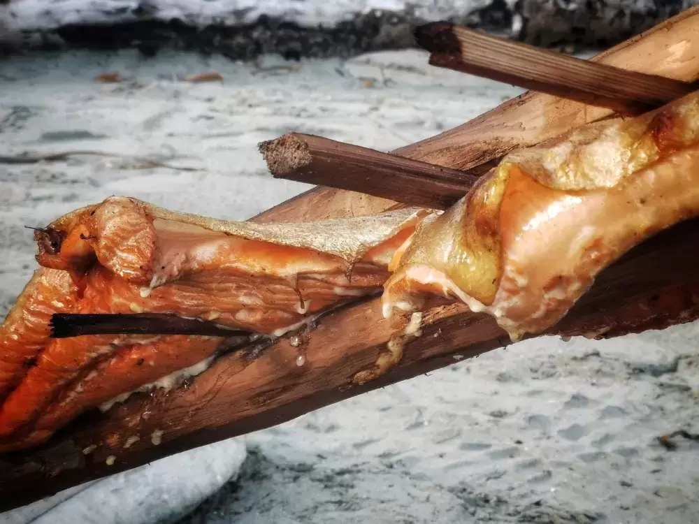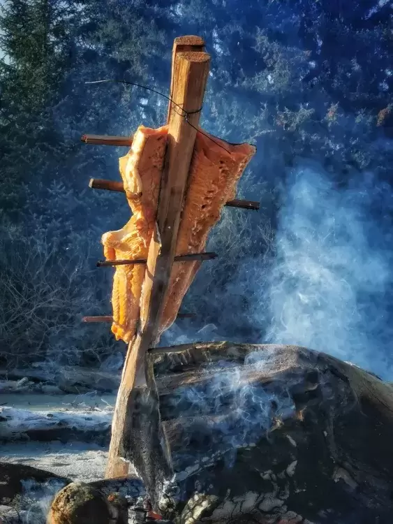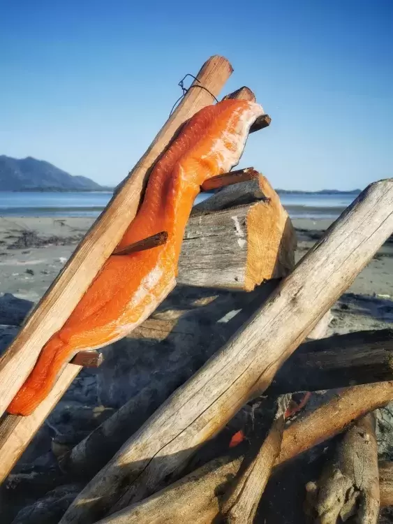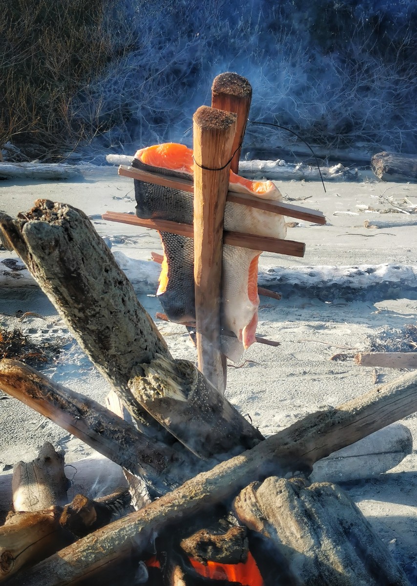 Just the other week, John and Callewaert shared in a similar tradition. With a view of Opitsaht floating in the distance, the couple cooked a salmon kluup-chus. It’s a traditional style of cooking salmon, where the fish is butterflied open and secured between cedar sticks before being placed in the smoke over the fire.