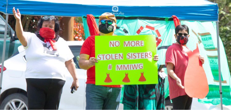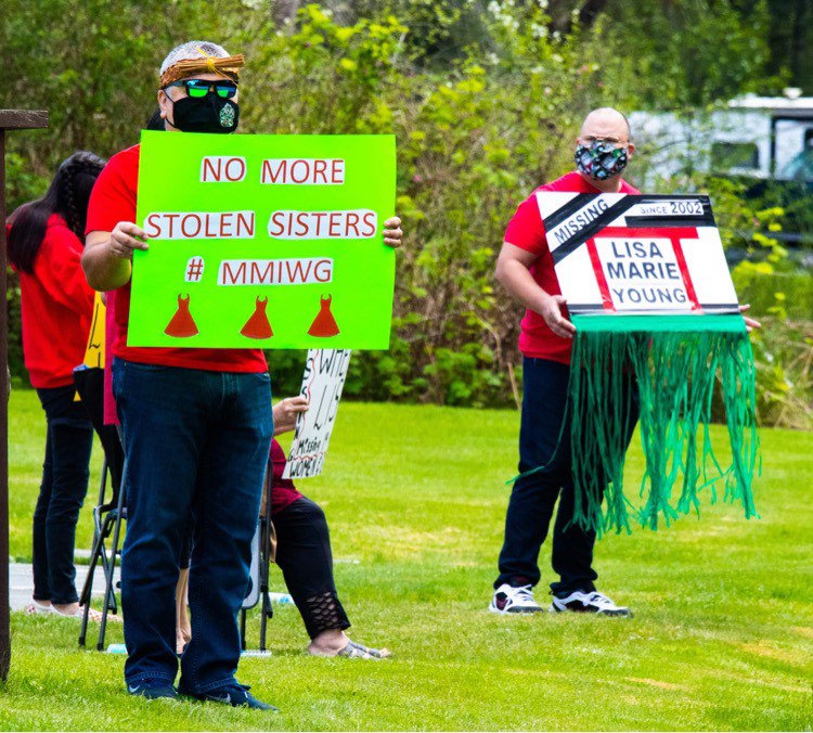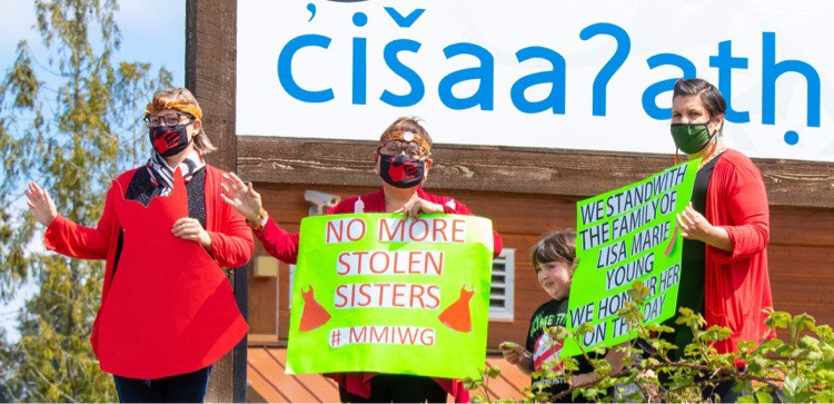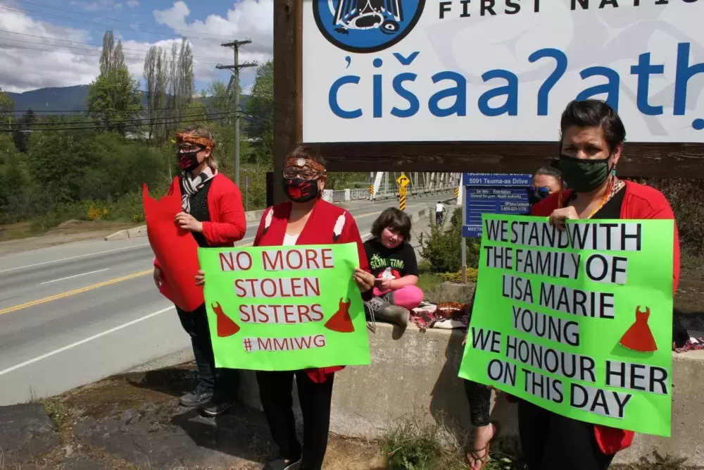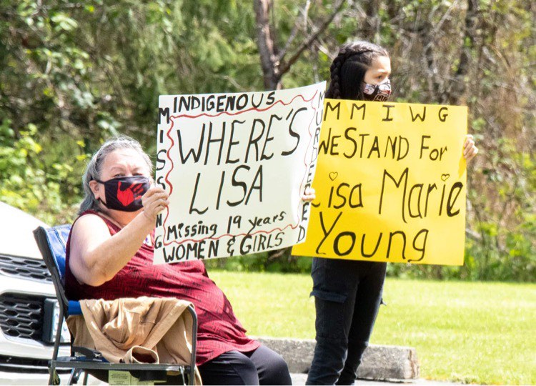 Dawn Foxcroft (left), Debra Foxcroft and Kelly Poirier stand for Lisa Marie Young and other Indigenous women who have gone missing or fallen victim to homicide on Sunday, May 2, by the Tseshaht band office in Port Alberni. On Sunday, which is Young's birthday, others were standing for her from noon to 1 p.m. elsewhere on the Tseshaht reserve and in other locations on Vancouver Island, including in downtown Nanaimo.