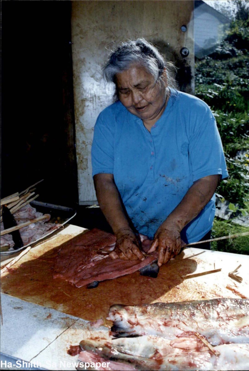 “Late Mary Amos did the same thing at Hesquiaht Harbour,” Julia recalled, saying Amos landed a few Chinook salmon in her skiff. “Fish did not go to waste – we ate it three times a day.”