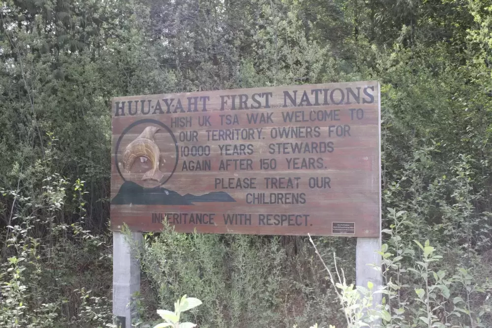 “People who violate our sacred principles are no longer welcome on our ḥahuułi,” reads a notice given to visitors at the checkpoint. “Violations will be dealt with to the full extent of the traditional laws of the Huu-ay-aht Ḥaw̓iih and the laws of the Huu-ay-aht Government and Canada.”