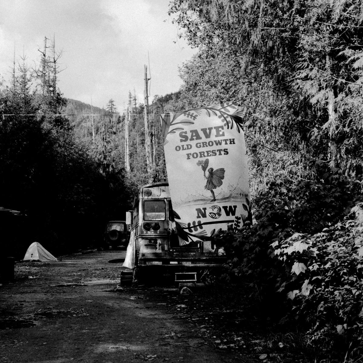 To prevent access to an old-growth grove in the Gordon River Valley, the Rainforest Flying Squad erected the Eden Camp, near Port Renfrew.