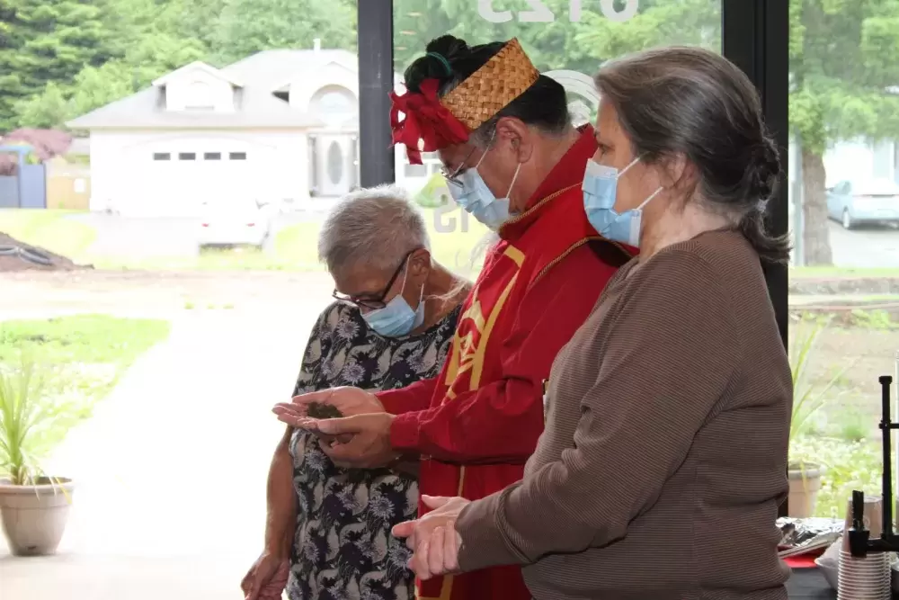 A bout of heavy afternoon rain forced the ground-breaking ceremony inside the 20-unit apartment facility, where Haa’yuups (Ron Hamilton) of the Hupacasath First Nation performed a chant, following the Nuu-chah-nulth tradition that accompanied the raising of beams when a building was constructed in the past. Haa’yuups turned soil from the future site of the new building in the hand of Darleen Watts, president of the Westcoast Native Healthcare Society.