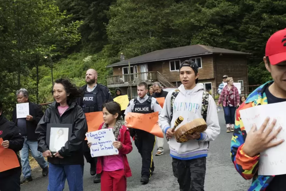 Singing and drumming rang throughout the streets of Esowista and Ty-Histanis on Friday, as Tla-o-qui-aht First Nation (TFN) council representatives, community members and RCMP joined together for a march near Tofino.