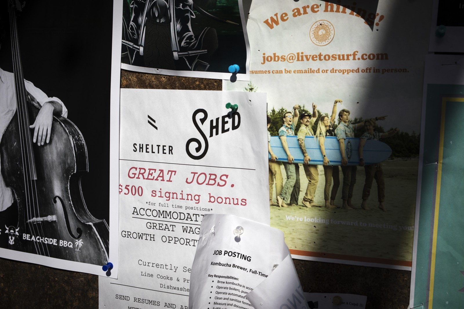 On a community bulletin board outside of the Tofino Co-op Food Store, Shed restaurant advertised a $500 signing bonus for line-cooks and dishwashers.