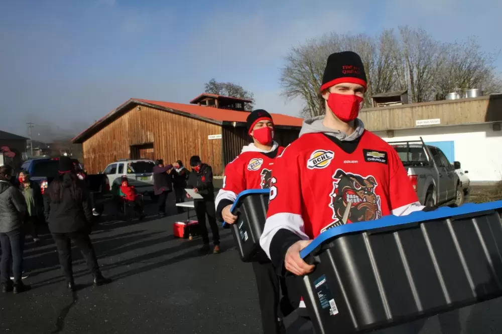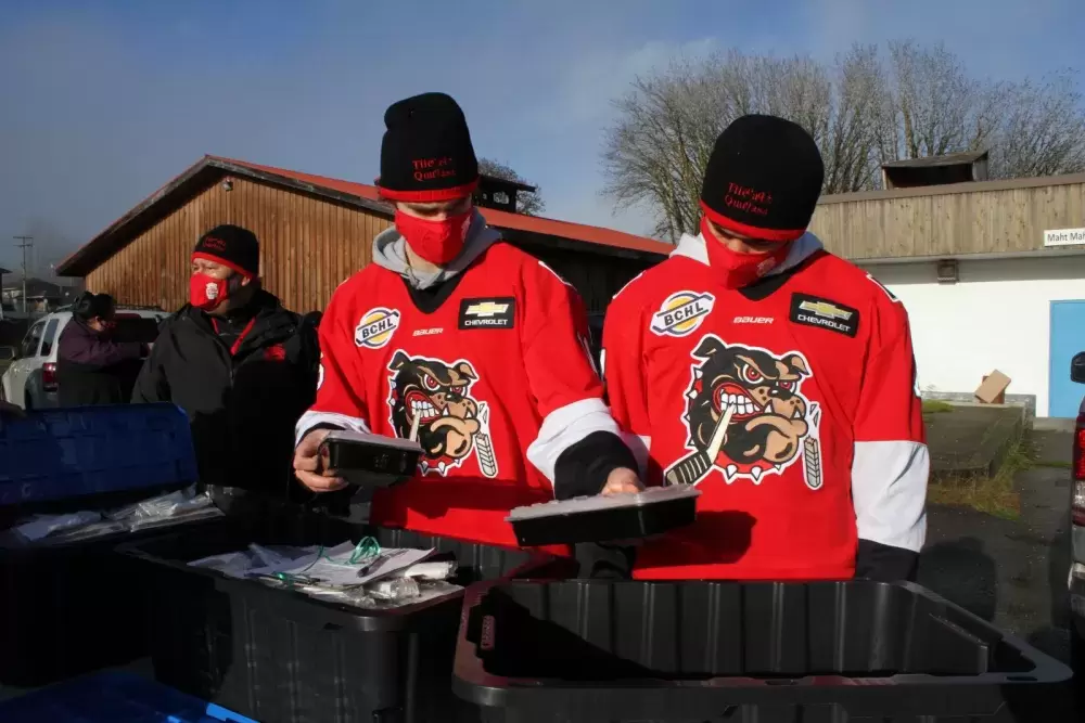 Staff gathered outside of Maht Mahs on Dec. 8 to deliver the meals to a long list of needy recipients compiled by the department. Volunteer help was also provided by the Alberni Valley Bulldogs BCHL hockey team, as well as members of the Port Alberni RCMP.