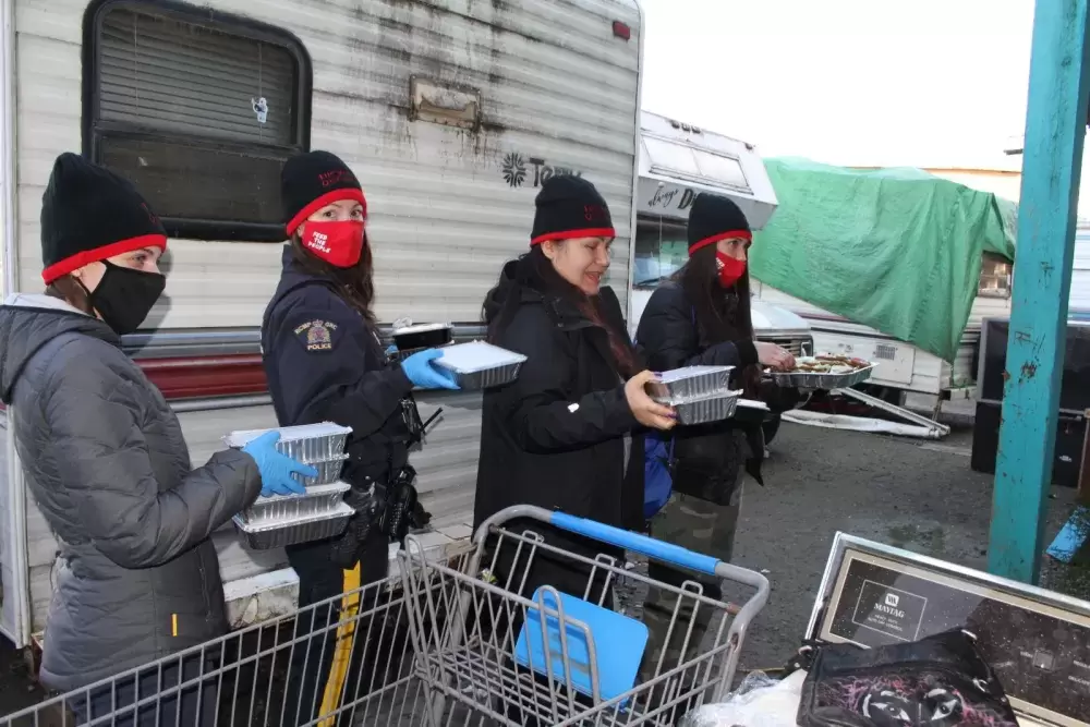 Police assisted in delivering meals to high-priority neighbourhoods on Third, Fourth and Fifth Avenue, including a growing collection of trailers set up on an empty lot next to a Fourth Avenue apartment building.
