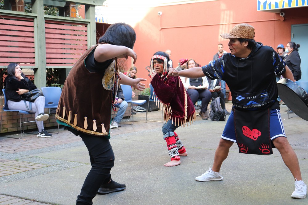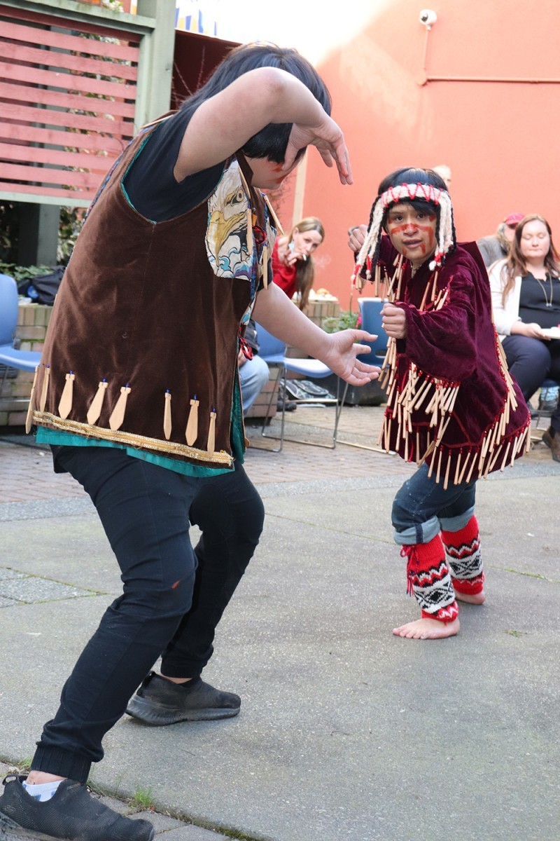 As people ate, Joe Thomas and his family from Esquimalt First Nation provided entertainment in the form of drumming, dances and stories in the courtyard. Inside the community centre more drumming could be heard as people were invited to take part in brushings. A Nuu-chah-nulth cultural group also provided entertainment at the event.