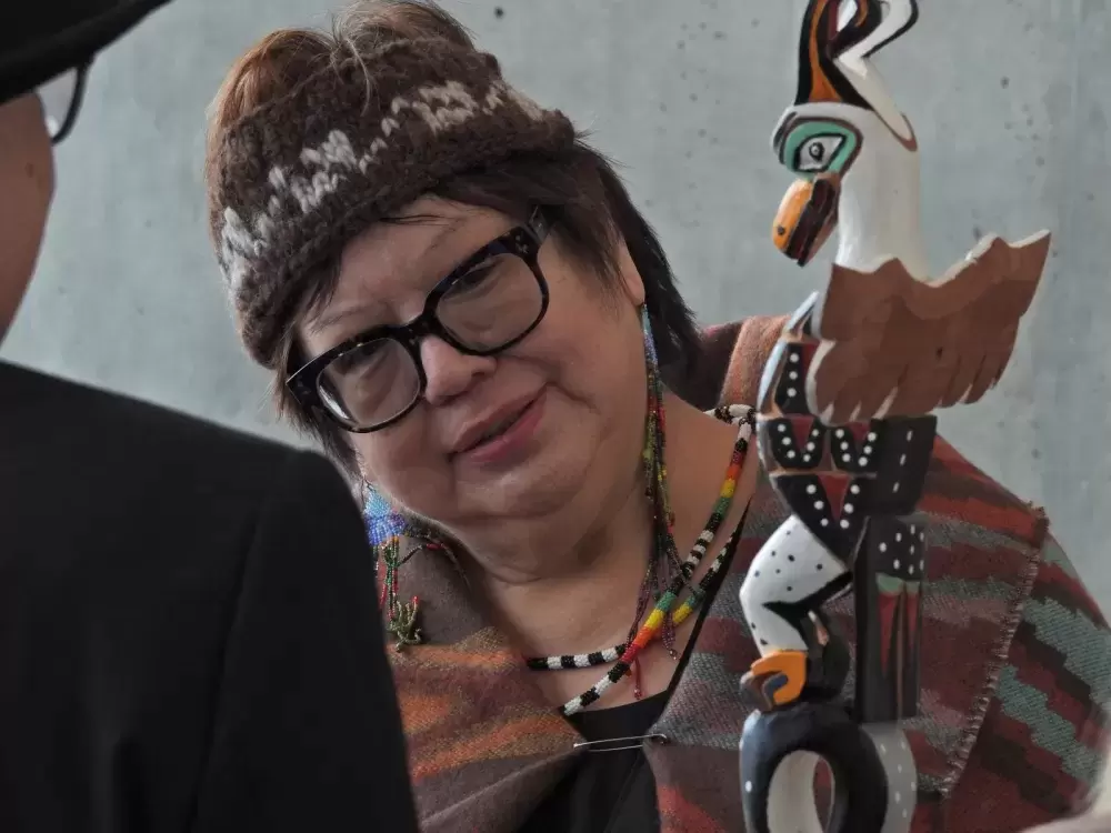 Carved by Ts’usquinuxn (William Good), a hereditary chief and master caver from Snuneymuxw First Nation, the talking stick was crafted in the traditional Coast Salish style while paying homage to Sayers’ Nuu-chah-nulth heritage. It was gifted to Sayers by the University of Victoria, which commissioned the creation of the piece.