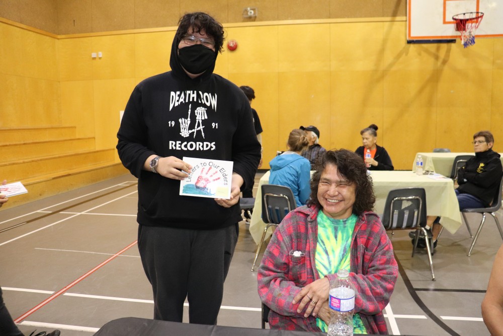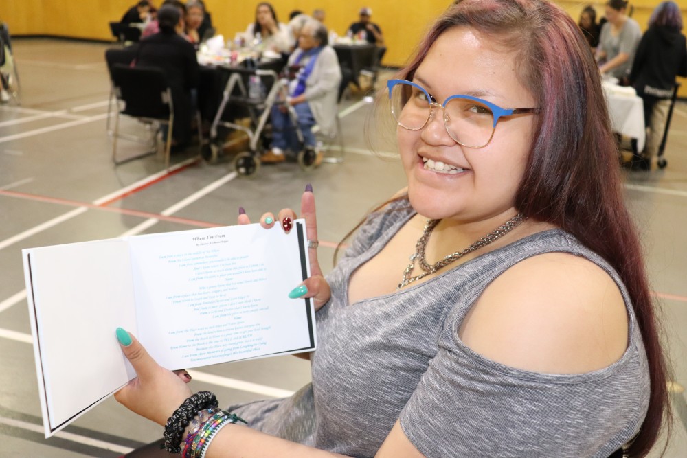 To the elders, she said, “Your kids and grandkids wrote their thoughts and feelings in stories, poems and letters and their teacher printed their work.”