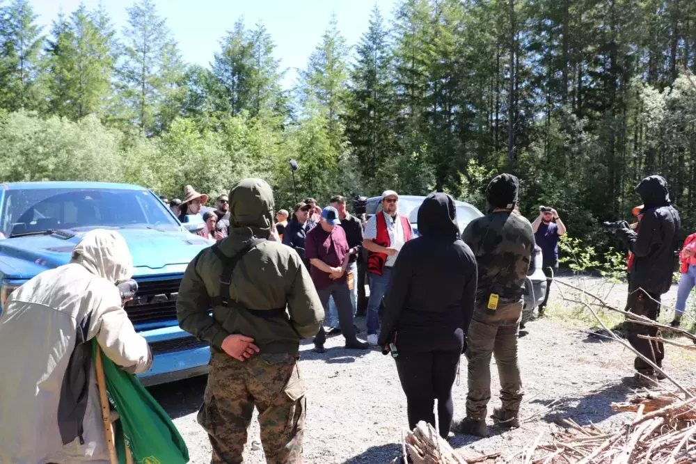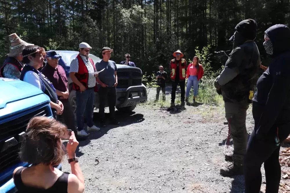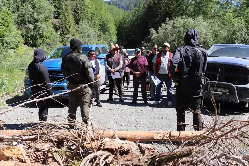 The letter was delivered on June 23 by Chief Councillor Brian Tate, who was supported by DFN Tyee Ha’wilth Satiixub (Paul Tate), and his fellow elected chiefs Robert Dennis of Huu-ay-aht, and Jeff Jones of Pacheedaht. A convoy of pickup trucks filled with members of each nation followed, including C̕awak ʔqin witwak guardians, C̕awak ʔqin forestry personnel, Sarah Fraser, B.C.’s assistant deputy minister of Rural Opportunities, Tenures and Engineering, as well as members of the media and the RCMP.