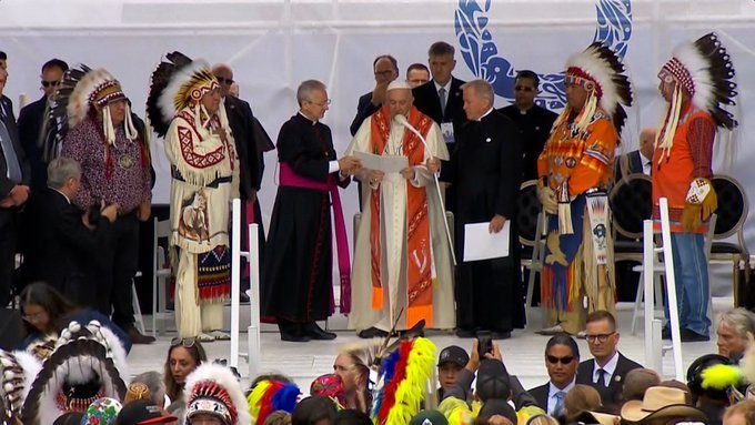 This message continued while Pope Francis gave a statement at the former site of the Ermineskin Indian Residential School in Maskwacis, Alberta.