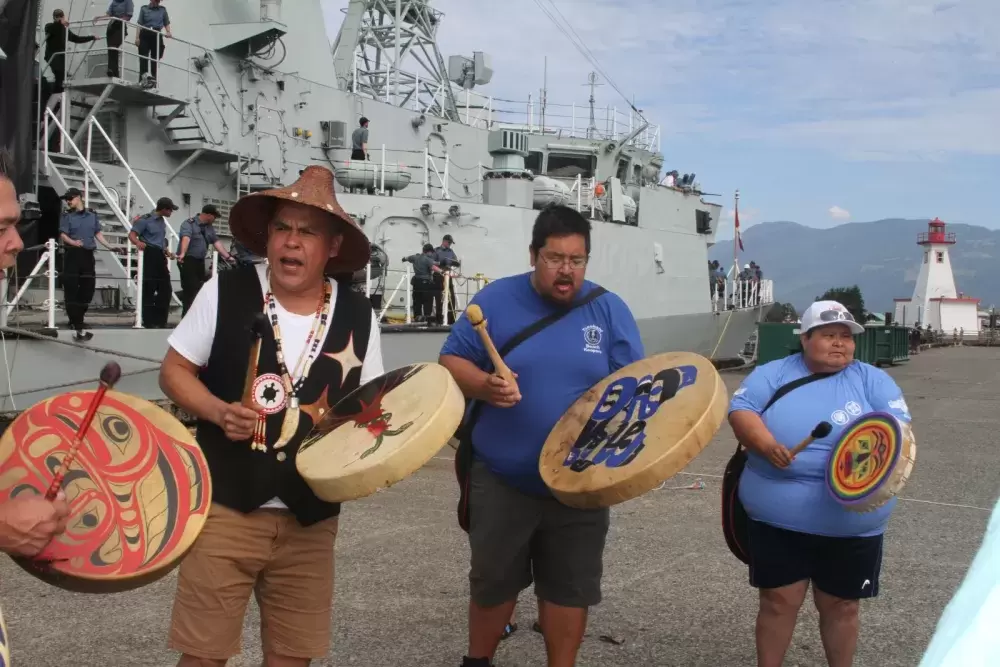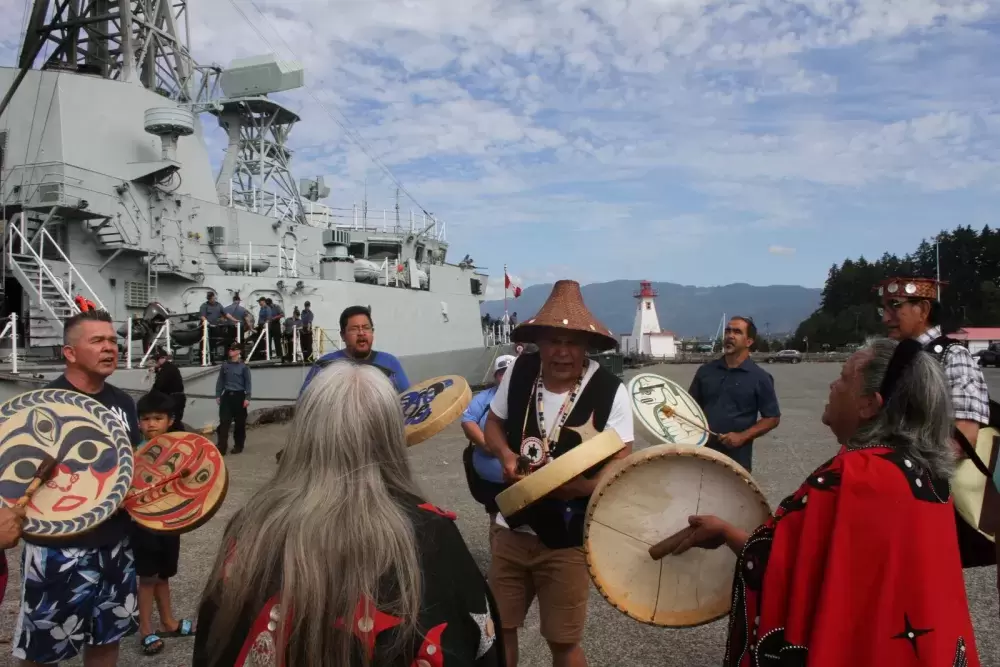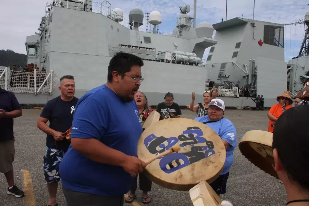 The First Nation welcomed Commander Sam Patrick to its territory, land that the navy vessel is tasked by the Government of Canada to defend. Tseshaht Chief Councillor Ken Watts explained that the ship was docked at the sacred site of ƛuukʷatquuʔis, Wolf Ritual Beach.