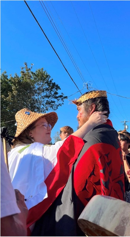 Following Nuu-chah-nulth culture, Frank partook in various challenges given by the family of his fiancée, before Kyra’s parents Samantha Gus and Richard Sam agreed to the marriage at their house. A dinner followed at Maht Mahs, with cooking provided by Kyra’s family, including fish her father recently caught in the Somass River. Kyra’s father said the family fed approximately 300 people at Maht Mahs, something that his new son-in-law didn’t expect would be offered.