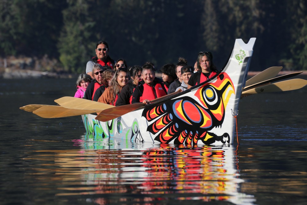 On Oct. 6 the day began with a group paddling from Port Alberni’s Harbour Quay in a traditional canoe recently acquired by Usma Nuu-chah-nulth Family and Child Services. Under a rising autumn sun the chaputs travelled down the Alberni Inlet, propelled by paddlers from the Eight Avenue Learning Centre, with others from Usma and the Alberni Drug and Alcohol Prevention Service helping in the brief journey.