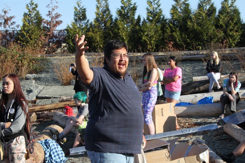 This is part of the explanation given by Tseshaht member Robert Watts to a large group of high school students, who came to the water for the final section of a multi-disciplinary learning unit on the science of buoyancy, teamwork and cultural identity.