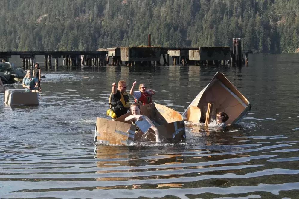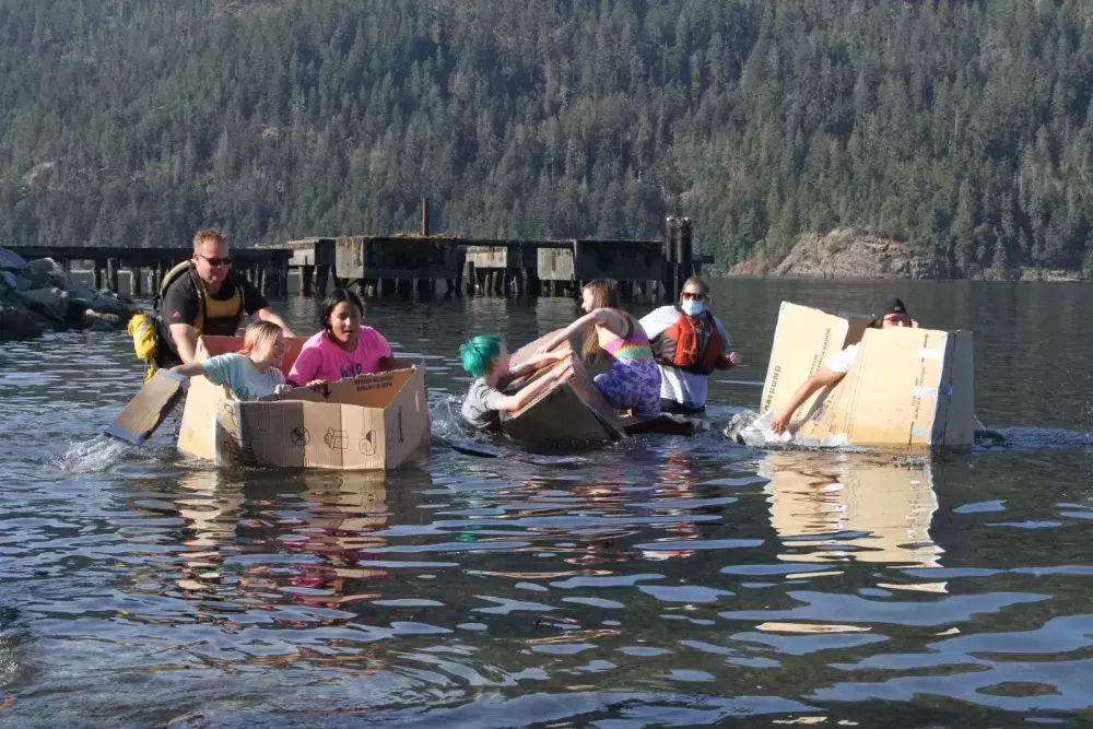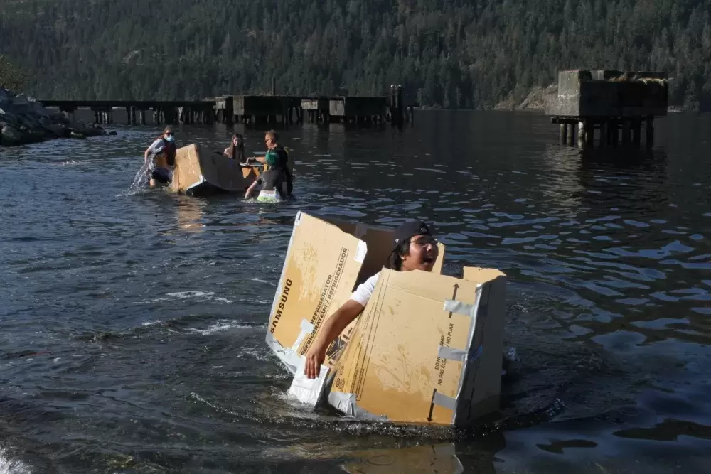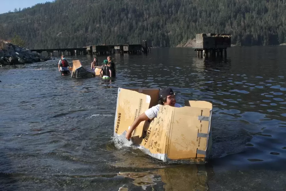 Employing principles of engineering with volume displacement calculations, the groups made cardboard boats, which were brought to Canal Beach for races with a student paddling in each one after the traditional chaputs left to return to its departure location. Most of these cardboard boats didn’t get very far, but one made by Grade 12 students Malcolm August and Aiden Cayer floated about 50 feet along the beach shore.