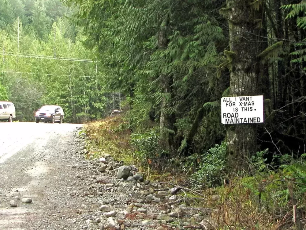 The unpaved logging road from Port Alberni to Anacla and Bamfield has been dusty in the summer, with growing potholes during wet months. Dennis said a huge safety concern has been dust behind logging trucks, reducing visibility.