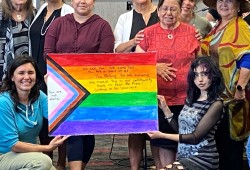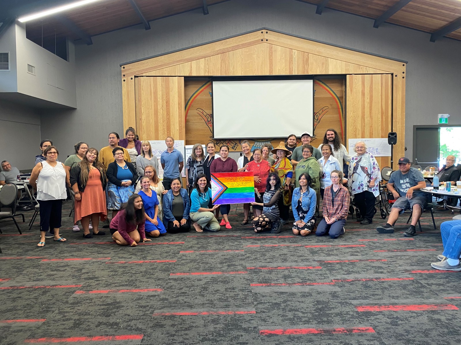 Charleson-Touchie reflects on the poster of a rainbow flag made in the previous Trauma and Resiliency workshop.