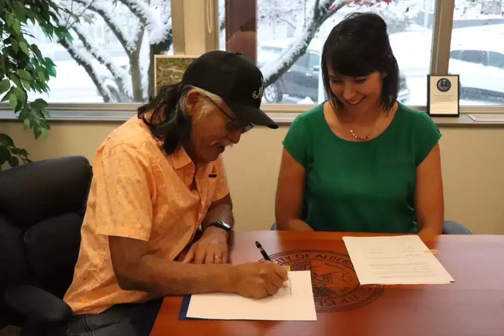 On Tuesday, Nov. 29, Gina Amos, Wally Samuel, George Frank, and Ed Ross met with Port Alberni Mayor Sharie Minions. They came together for the signing of the deed to the former Cedarwood Elementary School, where they plan to build an affordable housing complex for Ahousaht members living in Port Alberni.