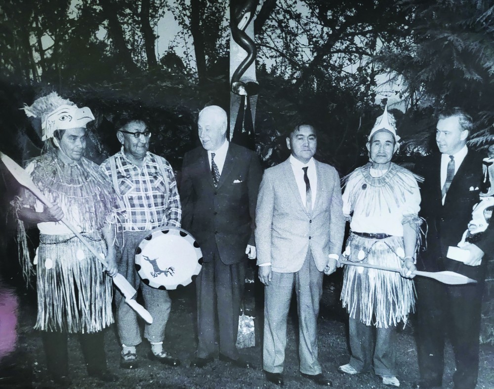 Just over 100 years later in 1967, John Jacobson, an Ahousaht historian, Second World War veteran and artist took part in a celebration recognizing Canada’s 100th anniversary. According to Quamiina, his uncle John Jacobson, or Kamiina as he preferred to be called, presented carved totem poles to George Pearkes, the lieutenant governor of British Columbia. He was joined by other Ahousaht elders, one being David Frank Senior.