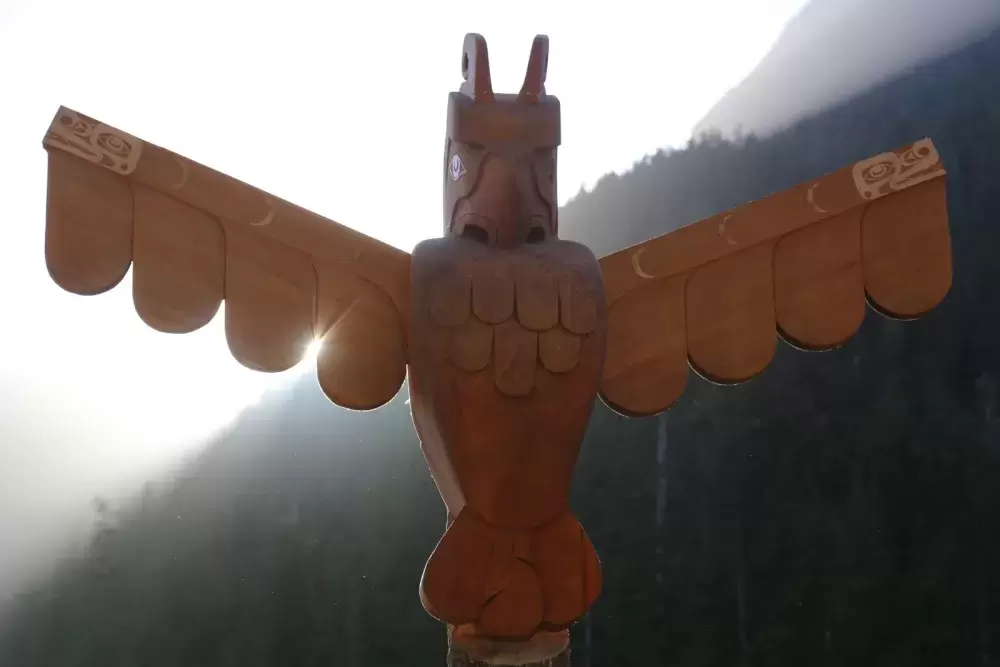The Thunderbird figure was made the same time as a Kakawin (Orca) pole in 2021. The Kakawin figure, also carved by Wenstob, stands on the beach at Esowista. Wenstob calls the first two carvings simple ones.