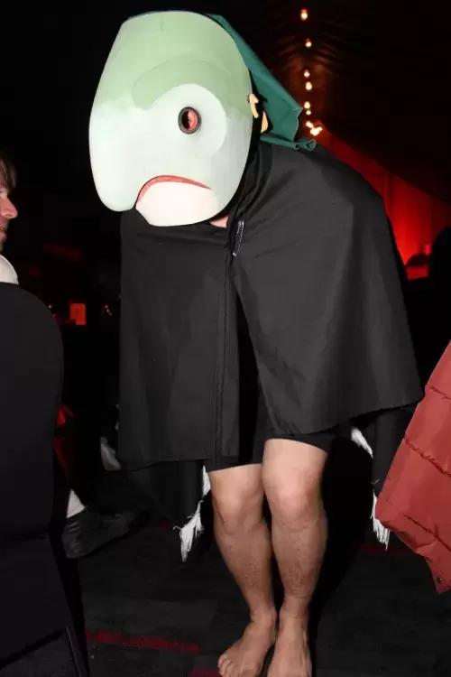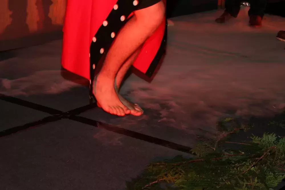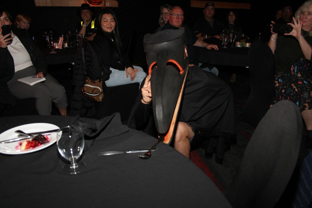 During Naaʔuu, Masso playfully dances through the crowd stealing forks and phones off tables with the beak of the raven.