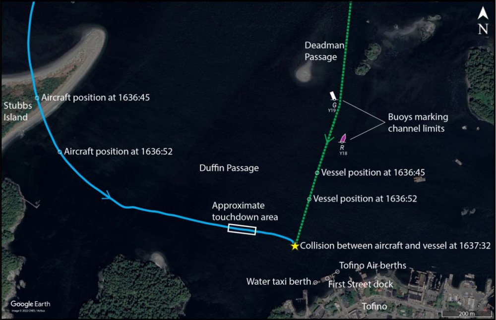 The TSB found that neither the pilot nor vessel operator recognized that their routes would conflict until it was too late for evasive action to be effective. They noted that Tofino Harbour is busy with a large number of float plane take-offs in close proximity to public docks that are heavily used by boat traffic.