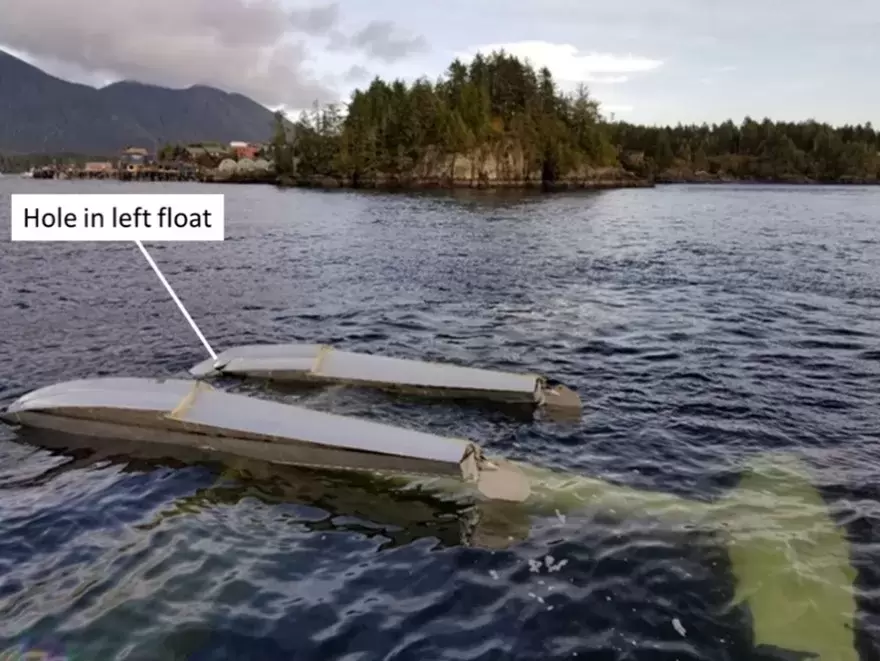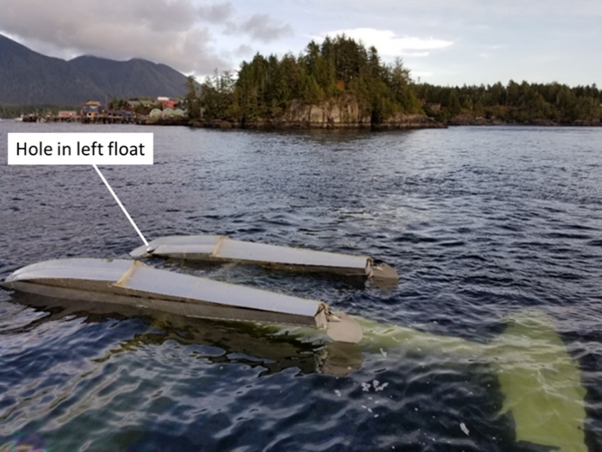 One of the pontoons on the float plane was ruptured in the accident, causing it to take on water. Within two minutes and thirty seconds, the float plane went vertical, nose down, sinking, with only the pontoons staying on the surface of the water.