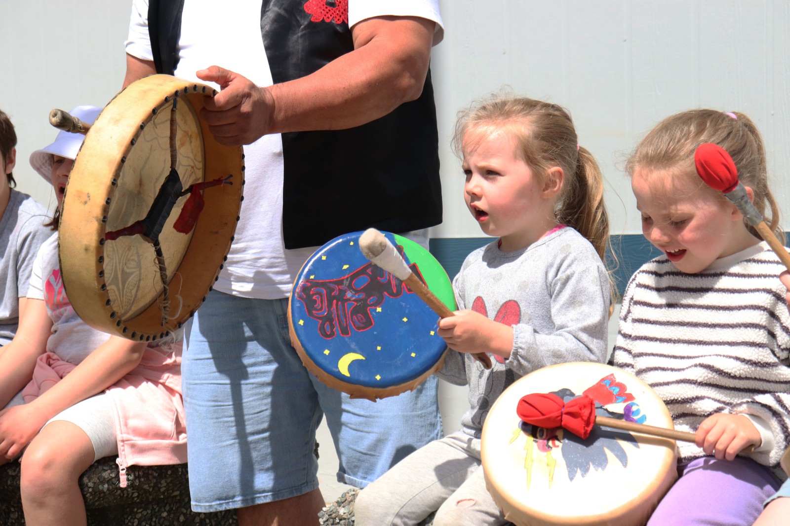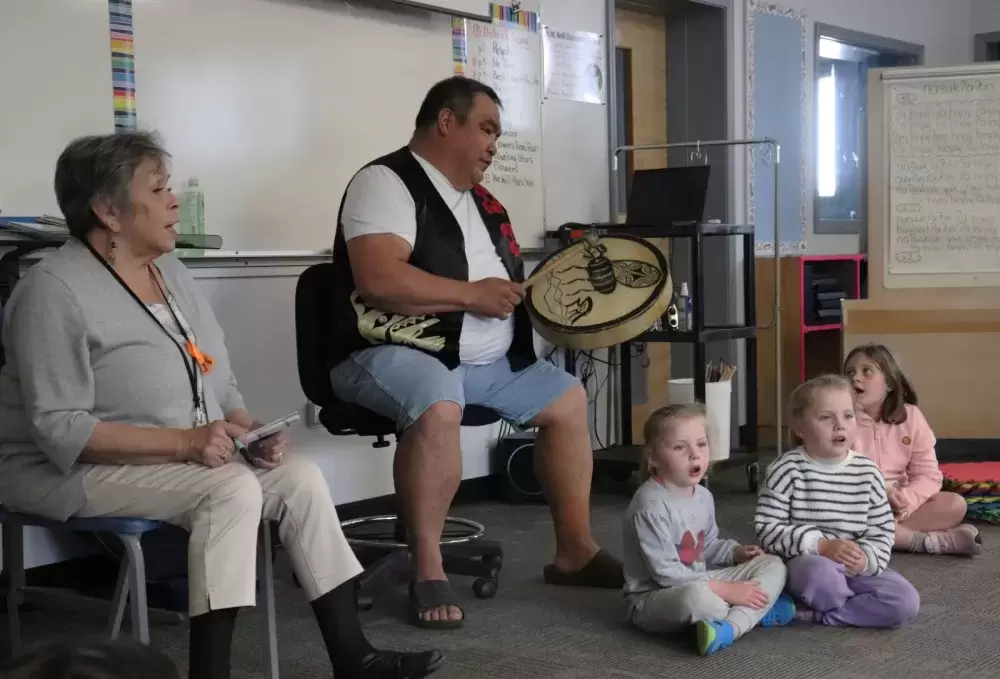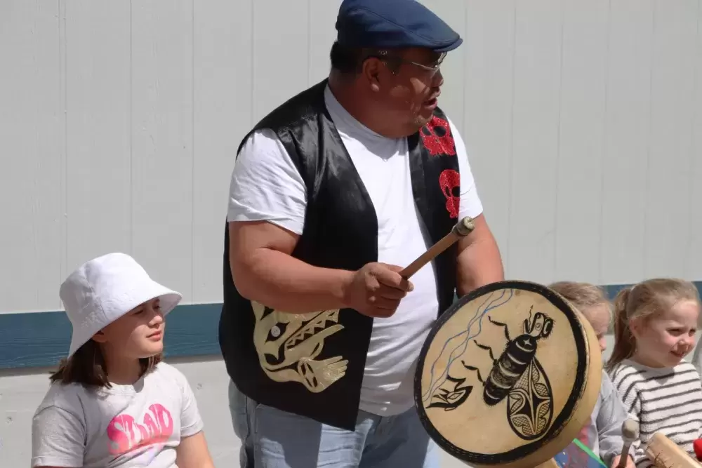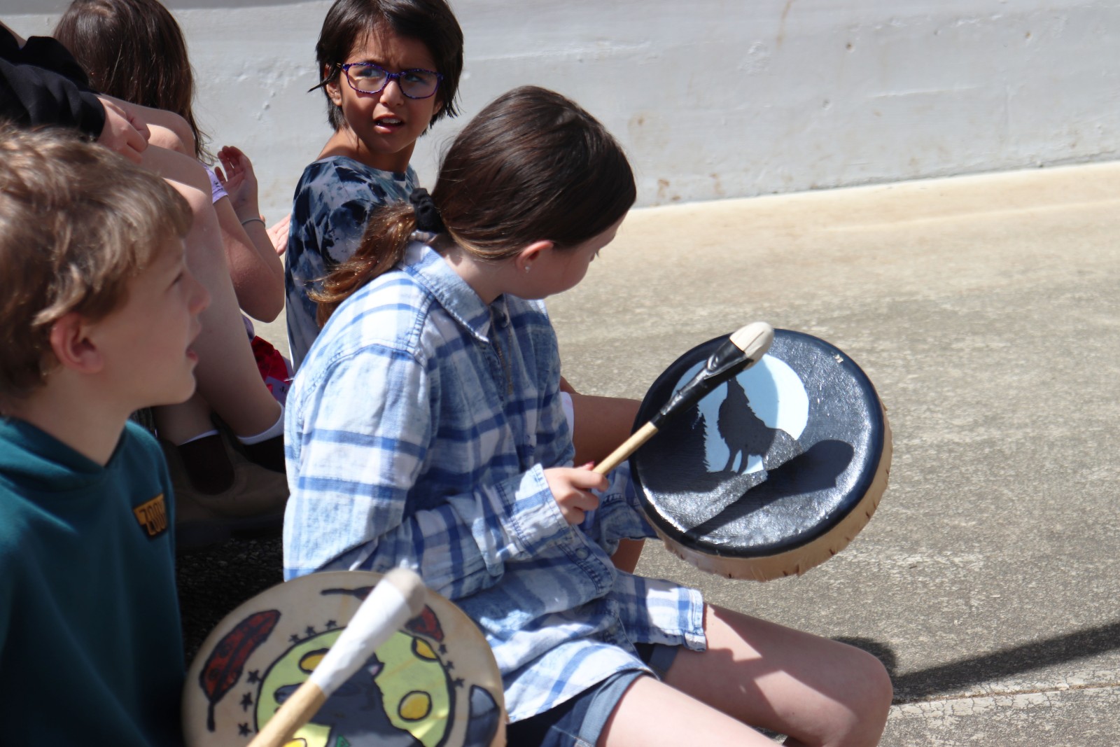 As the class prepared to drum their first song, The Equality Song, composed by Patrick Aleck of Stz'uminus First Nation and Penelakut Island, Martin Watts, lead singer and drummer, asked them, “We start without the drum because?”