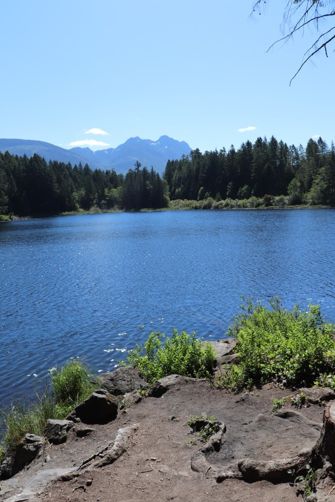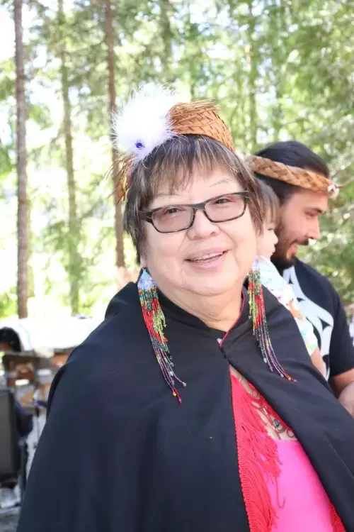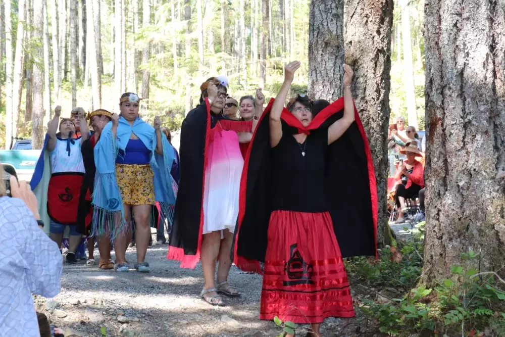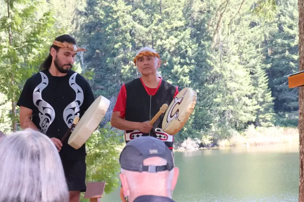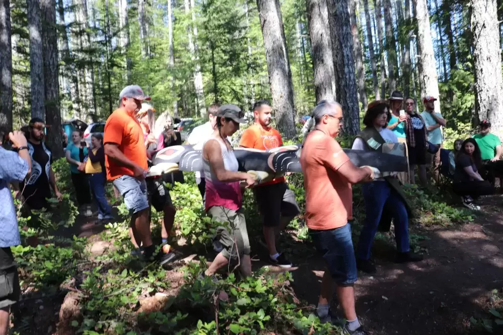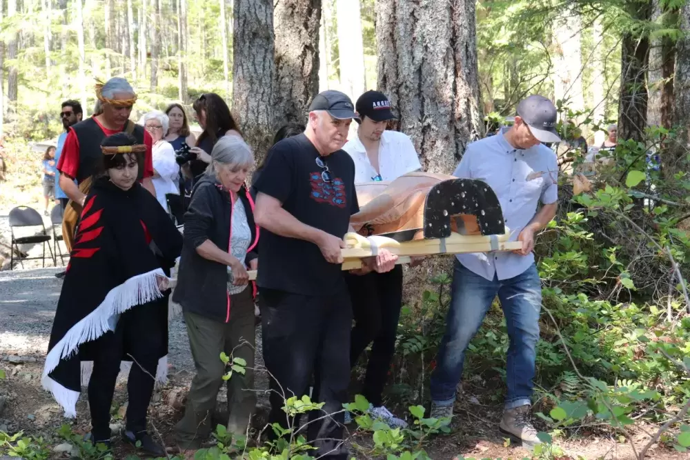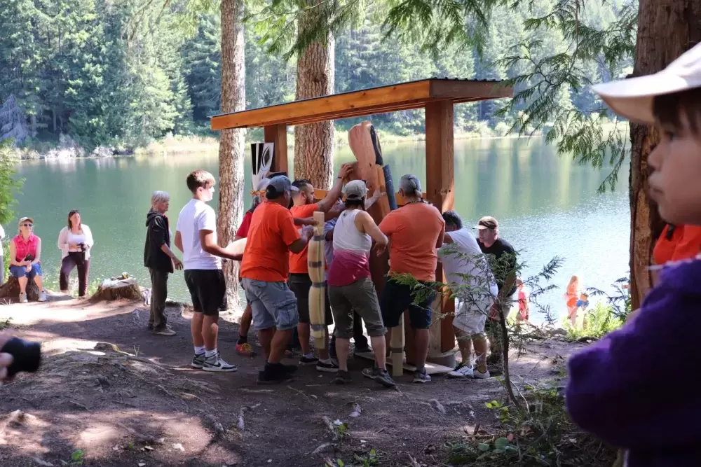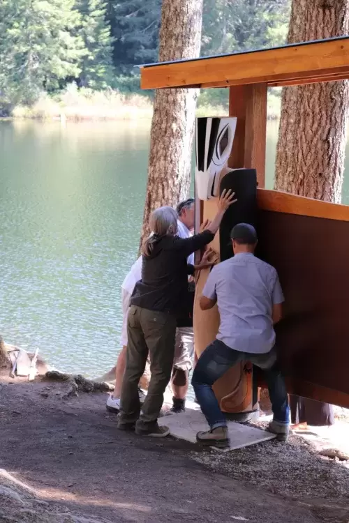 The celebration took place on July 1, at the edge of Loon Lake with the majestic Mount Arrowsmith looming over the other side of the water. Dozens of people walked down a short dirt path to the edge of the lake where the sculptures would be erected.