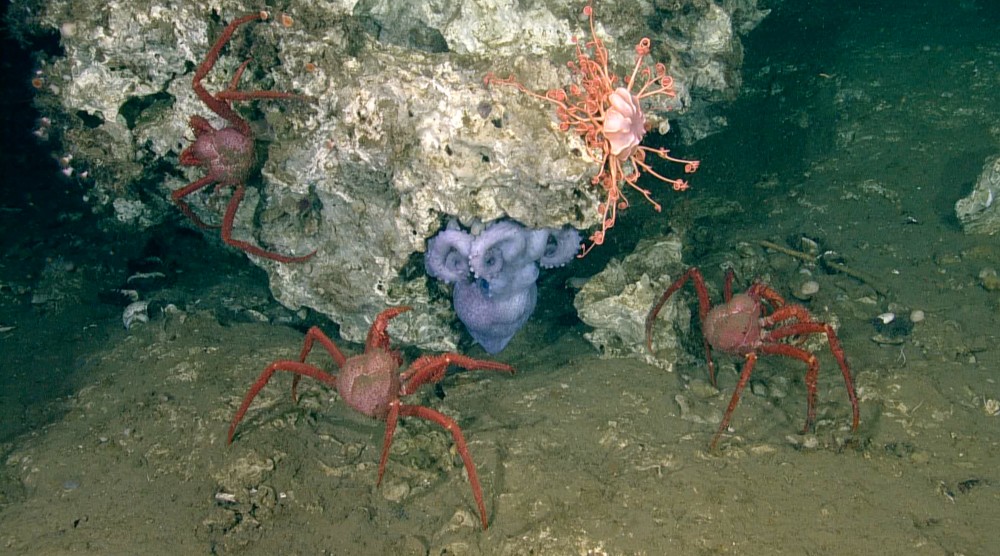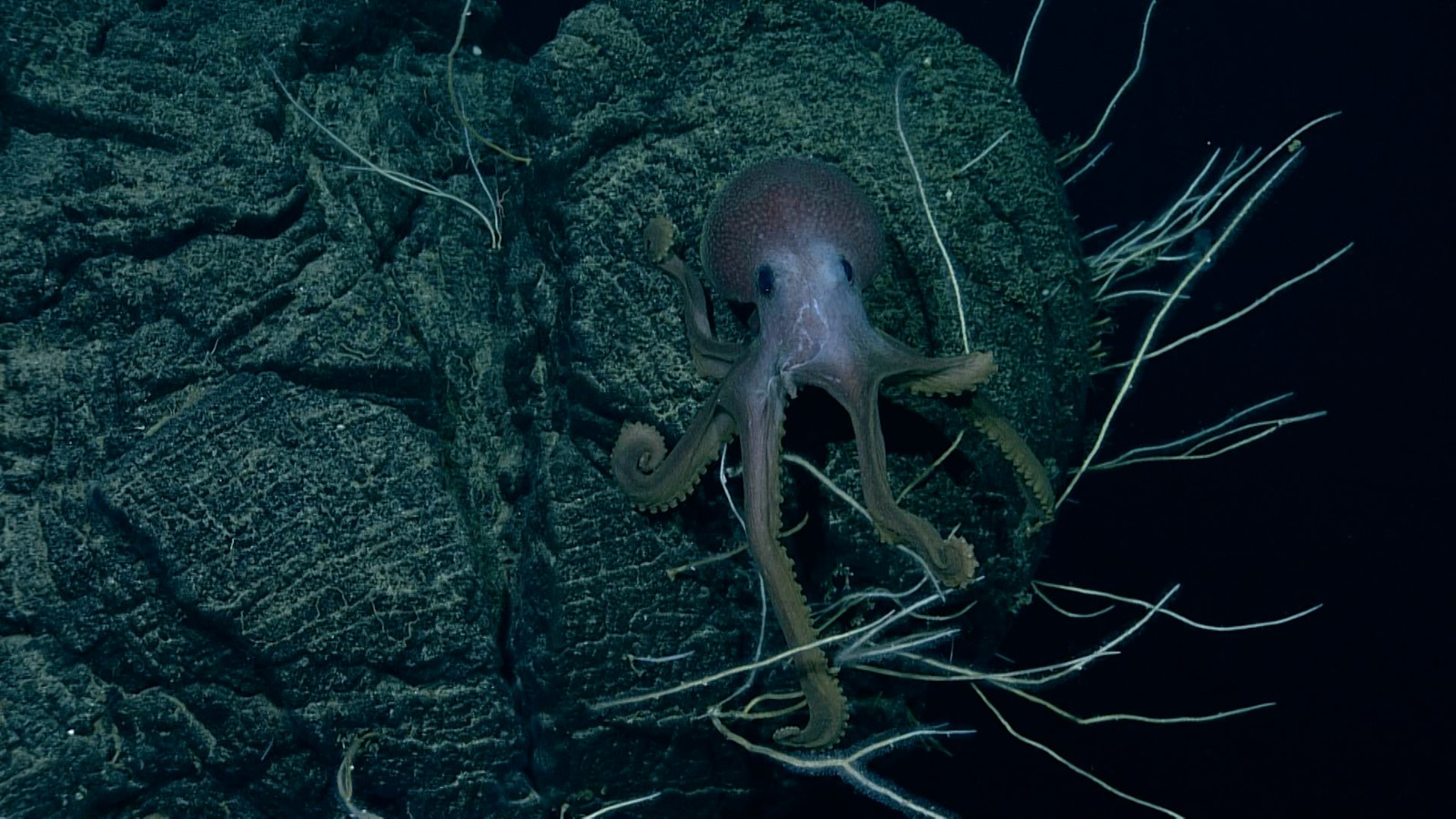 On their last dive of the expedition, along Hesquiat slope, they came across a nursery of deep sea octopus brooding on their eggs within cave-like features in carbonate rock created by the cold seeps.